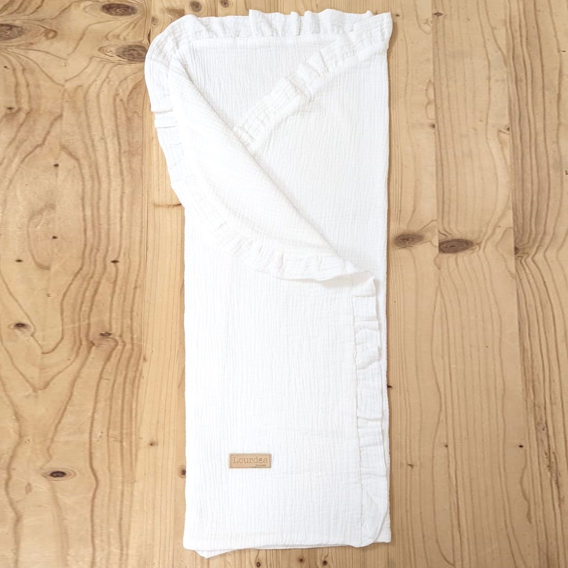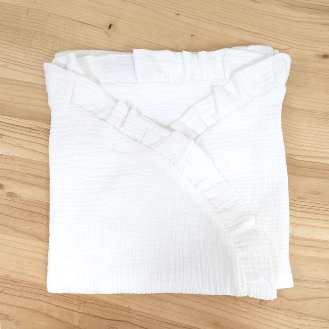 Manta/arrullo con volantes e interior en bambula de algodón orgánico muy suave. Un arrullo muy suave y manejable, pensado para primavera-verano, o para estar en casa.