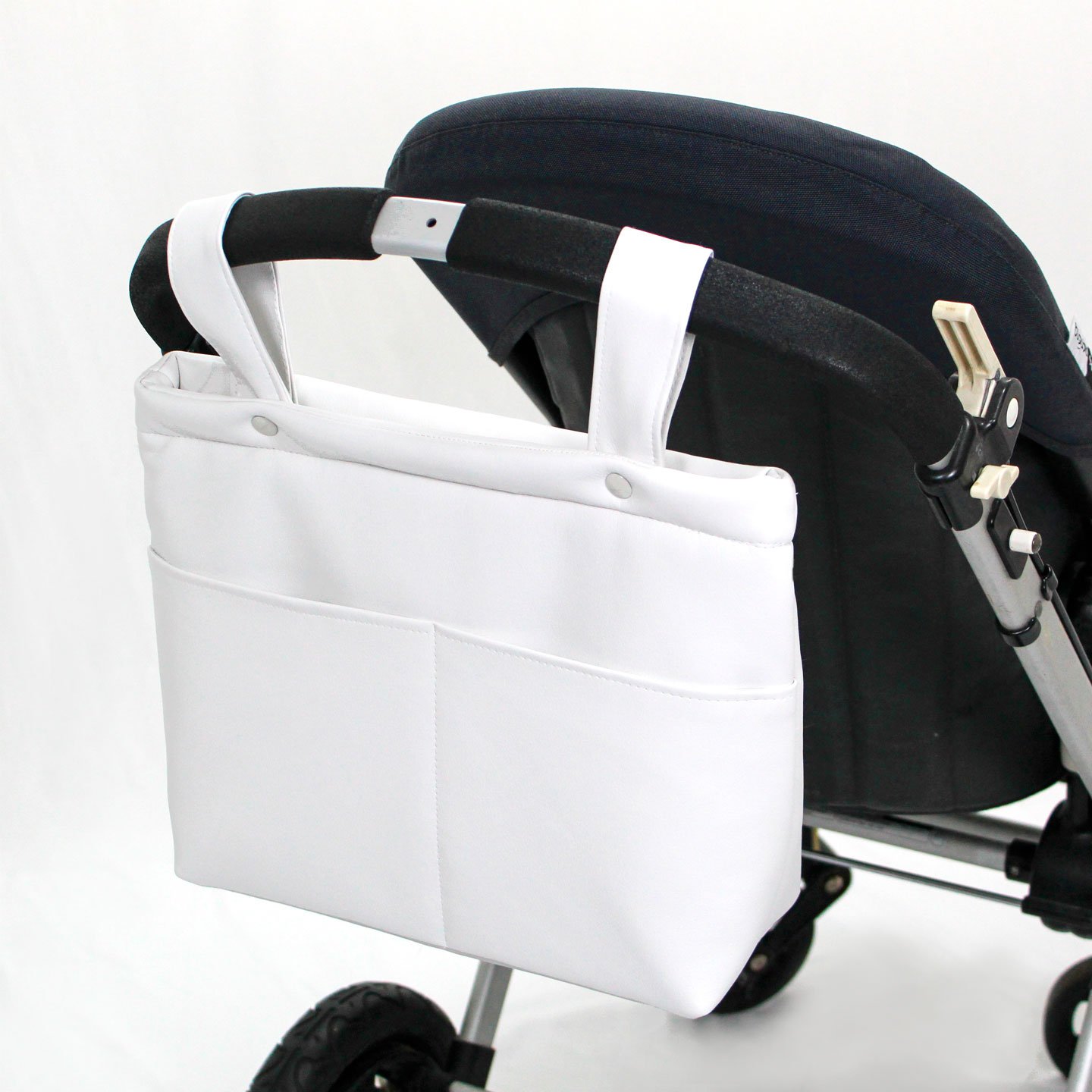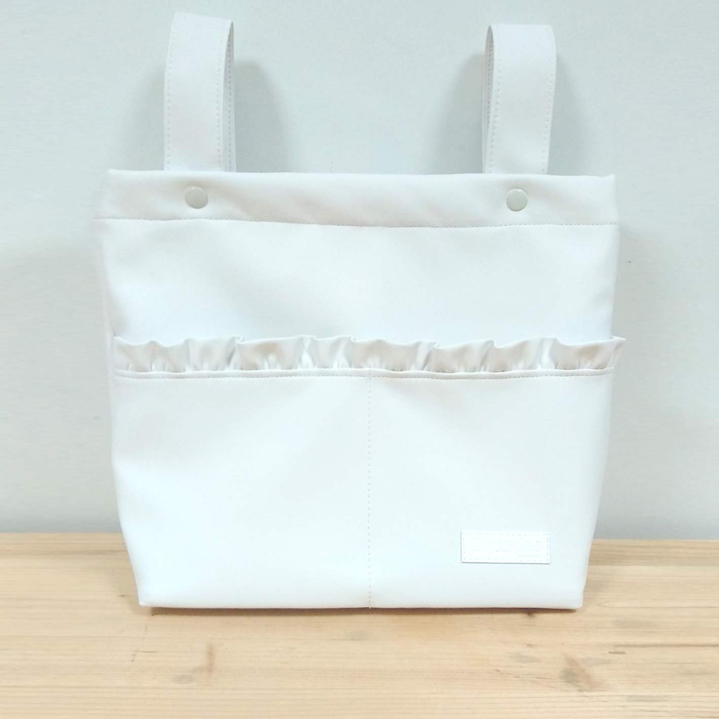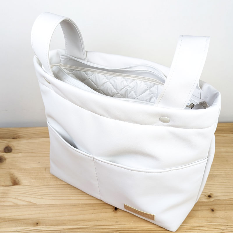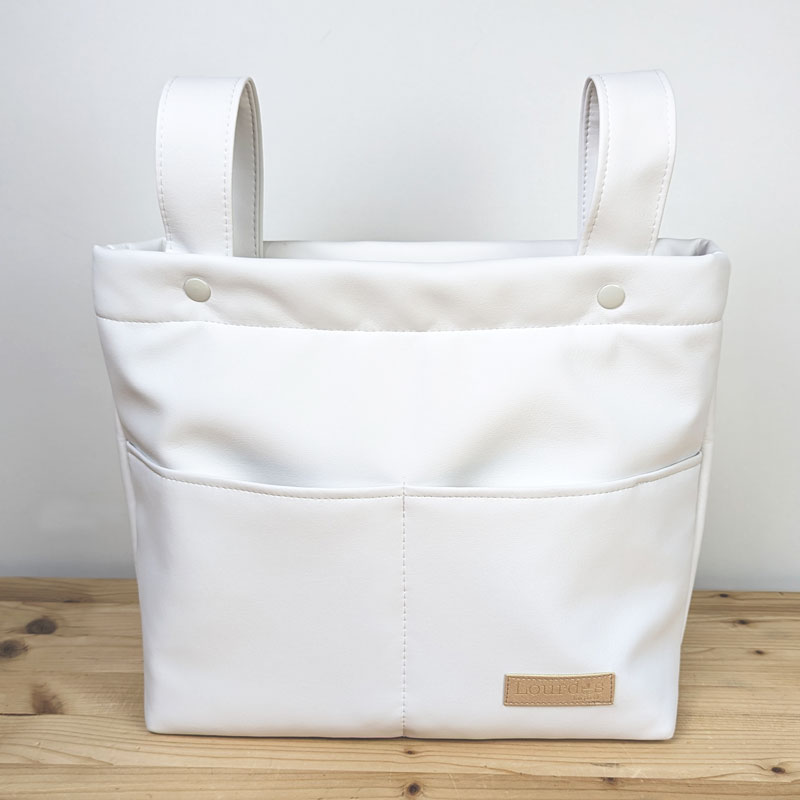 Bolso mediano paseo ( 33cm de ancho, 28cm de alto) blanco roto de polipiel de alta calidad . Asas cortas verticales para colgar en la silla. Cierre con cremallera y 2 bolsillos exteriores delanteros, prácticos para tener lo esencial a mano.
