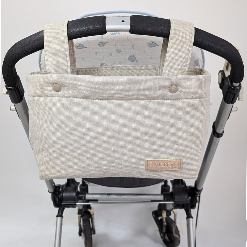Bolso pequeño de paseo(20cm de alto,30cm de ancho y 12cm de fondo). Asas cortas verticales para colgar en la silla y cierre con cremallera. Tamaña perfecto para llevar lo justo.