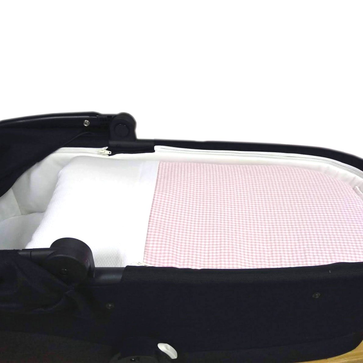 Saco para capazo cuadro Vichy rosa y blanco, combinado con pique blanco. El saco va cerrado con una cremallera a los dos lados, que fácilmente se pueden soltar. Los días de calor puedes utilizar solo la base.