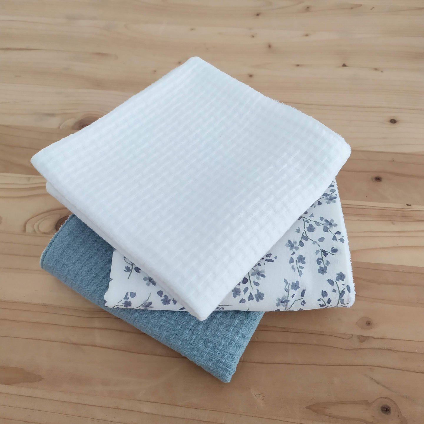 Pack de 3 toallitas multiusos. Tiene un lado estampado 100% algodón y el otro lazo de rizo suave blanco. Se pueden utilizar como salva babitas, paño mientras la lactancia,.. ,y muchos otros usos más.