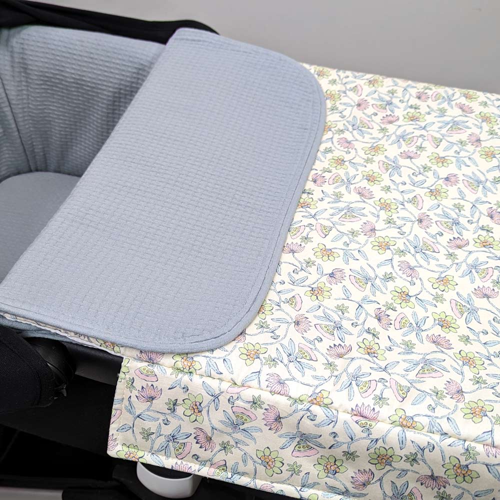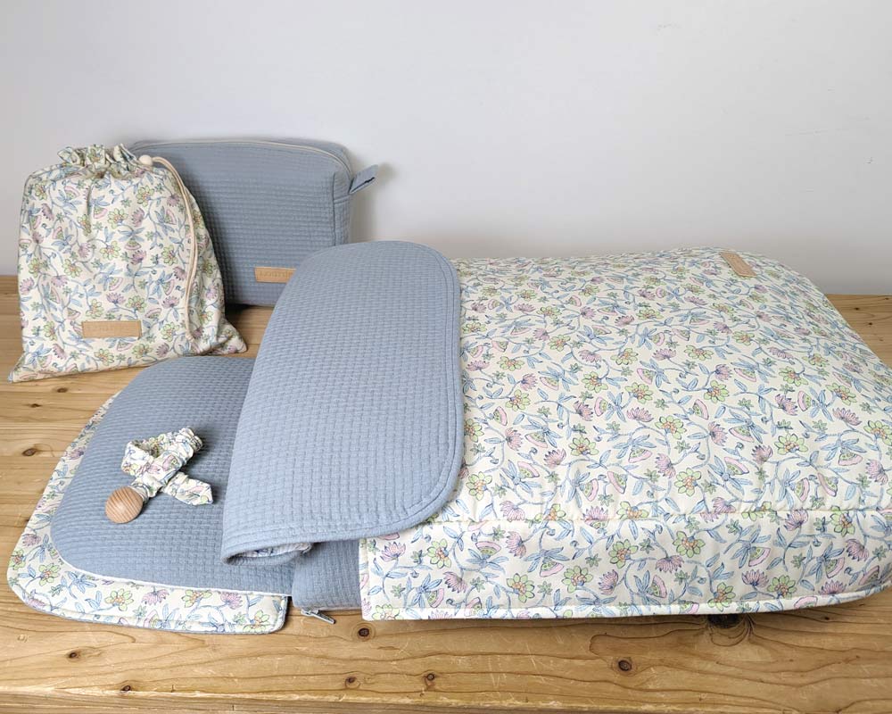 Cubre para el capazo con embozo y almohada reversible. Relleno fino no extraíble.